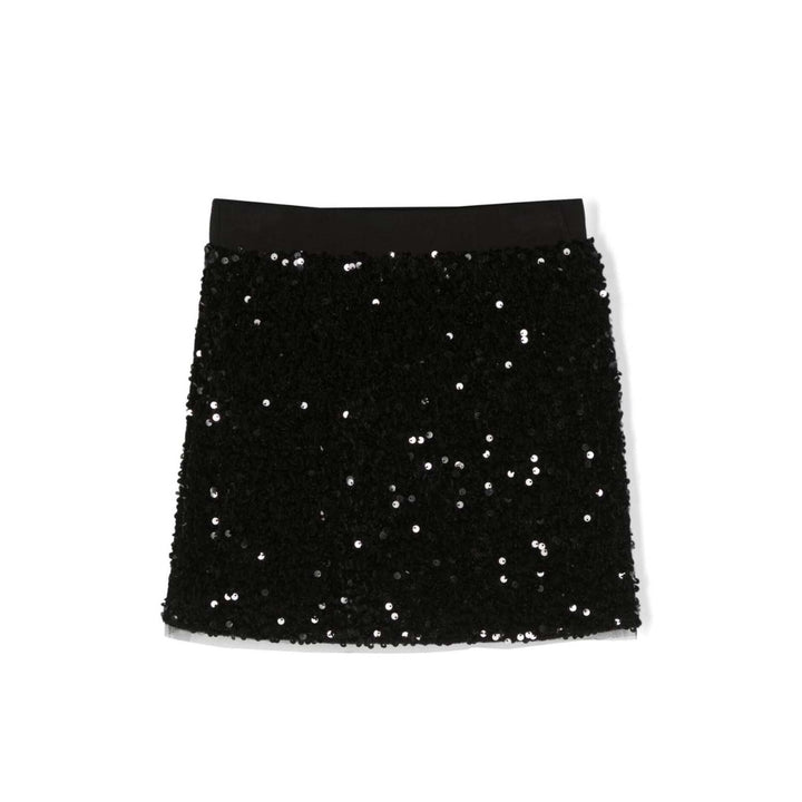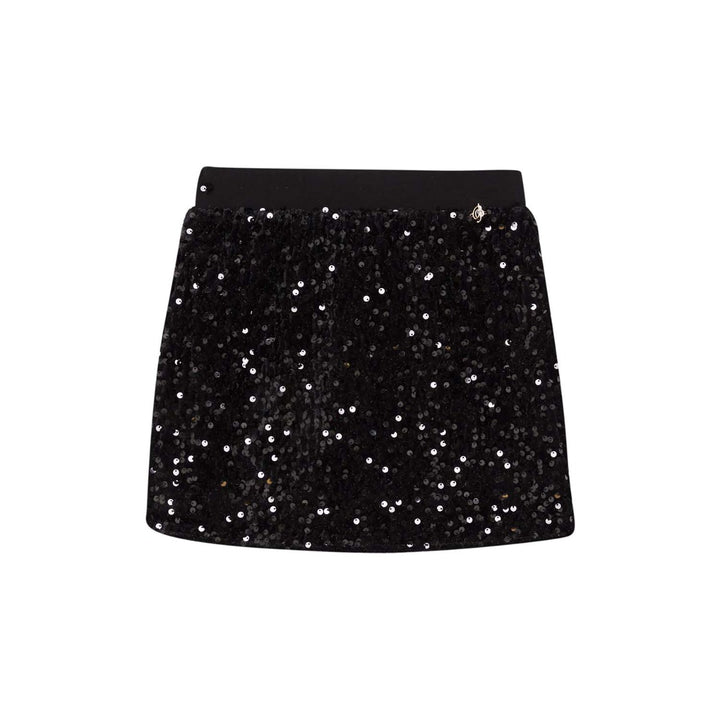 Miss Blumarine black sequin mini skirt with a tulle attached inside for a ball look. The skirt is perfect for a shiny and glitter theme party and can be paired with a feather tee or a sequin tee.