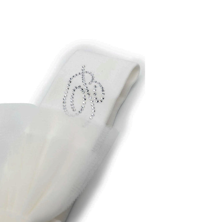 bow-detail hairband from MISS BLUMARINE featuring cloud white, stretch-cotton, crystal embellishment, tulle inserts, bow detailing and adjustable fit.