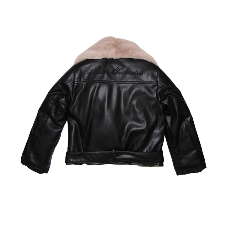 Miss Blumarine Girl leather jacket with a furt collar and neck line. It has chains in front and on the side with leather rope hangings. Do not wash and dry clean instead. It is perfect for a winter party.