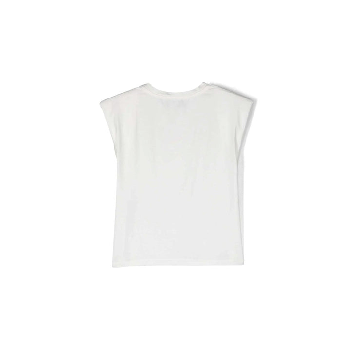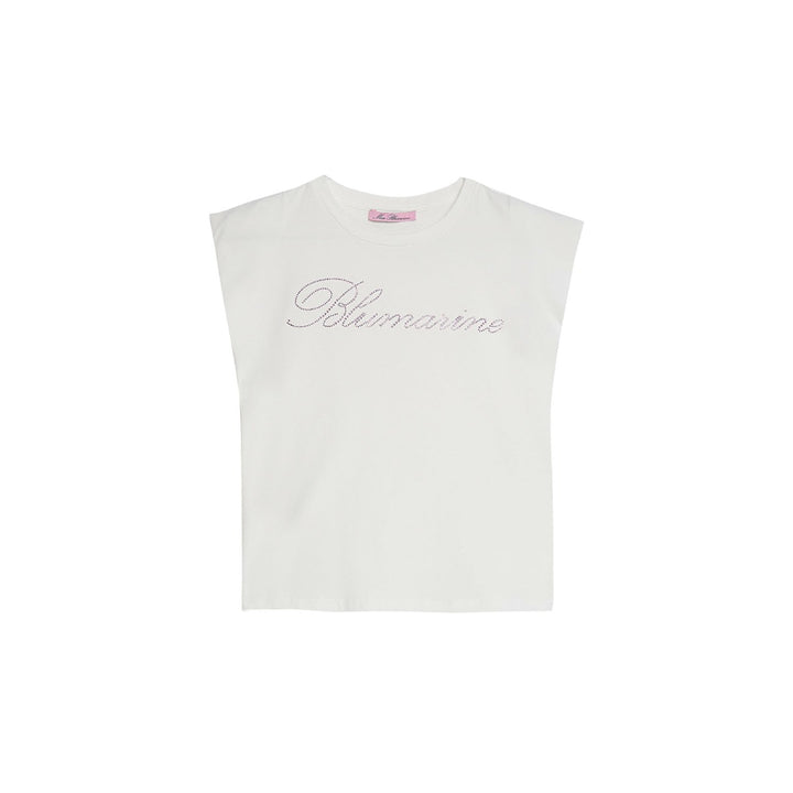T-shirt With Logo from Miss Blumarine - White Miss Blumarine cotton t-shirt for girl - Crew neckline - Sleeveless - Padded shoulders - Front contrasting color logo with strass