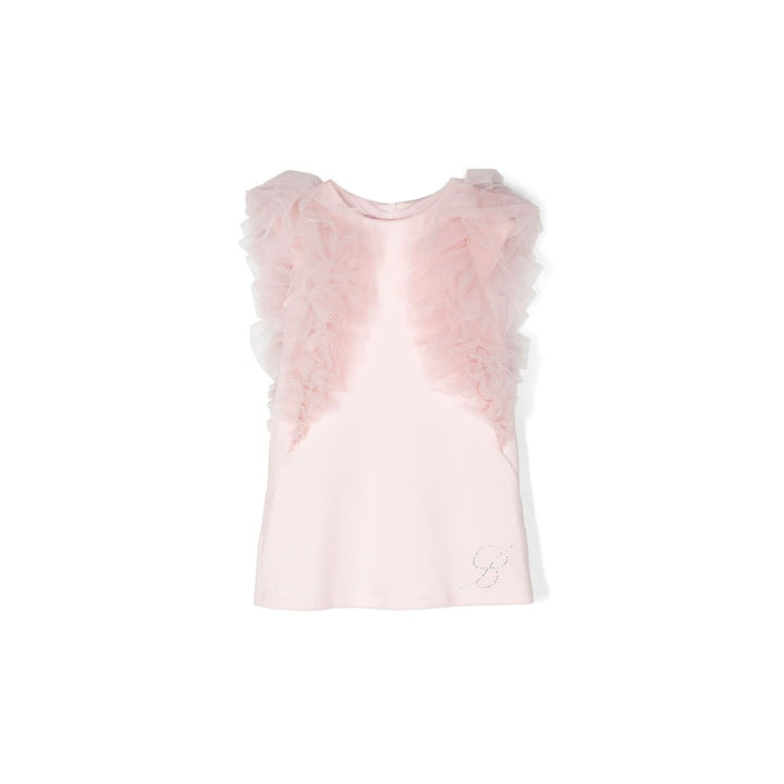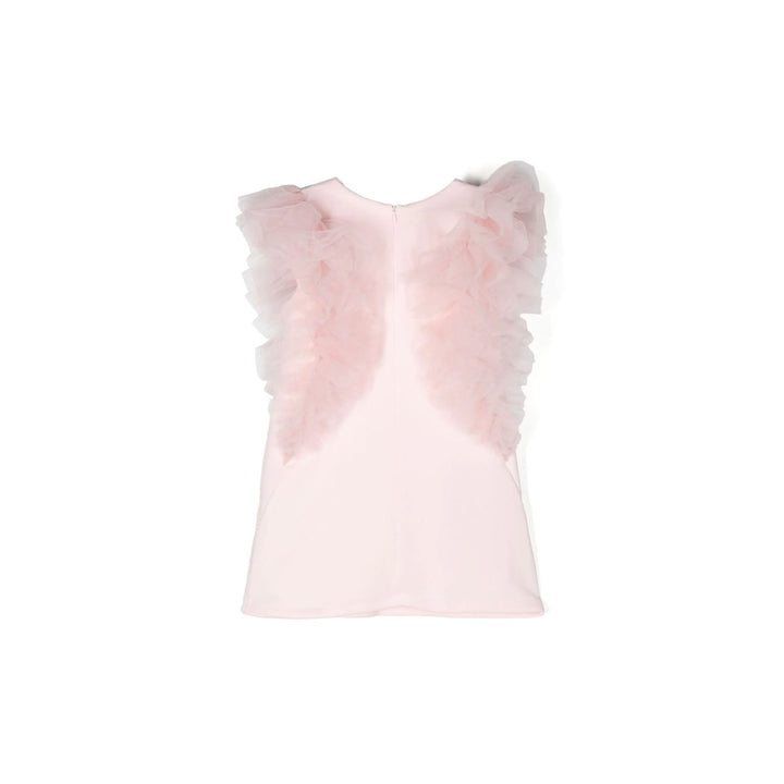 Pink ruffle-detail cotton dress from MISS BLUMARINE featuring white, stretch-cotton, ruffled detailing, straight hem, round neck and sleeveless.