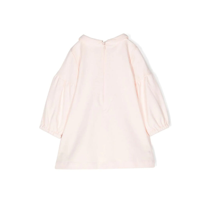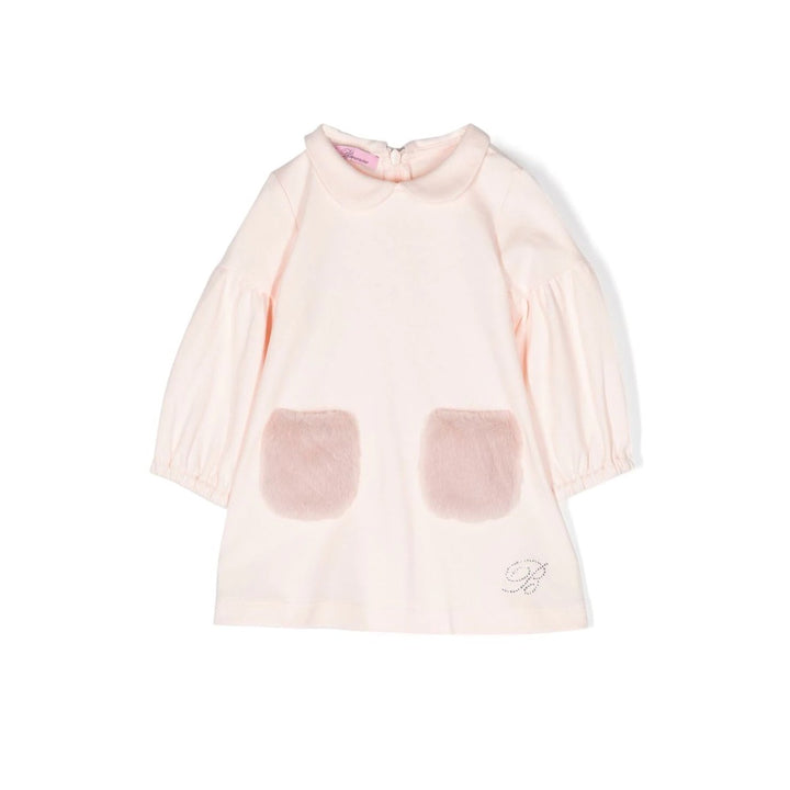 Miss Blumarine rose peach knee lenght dress with a princess collar and three quartered sleeve and a fur pocket in front. Choose it for your girls picnic and playdates.