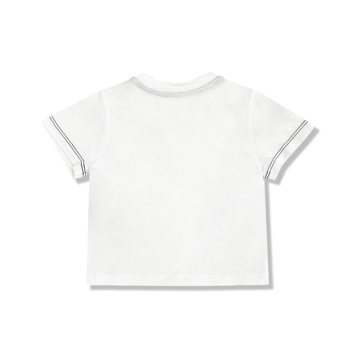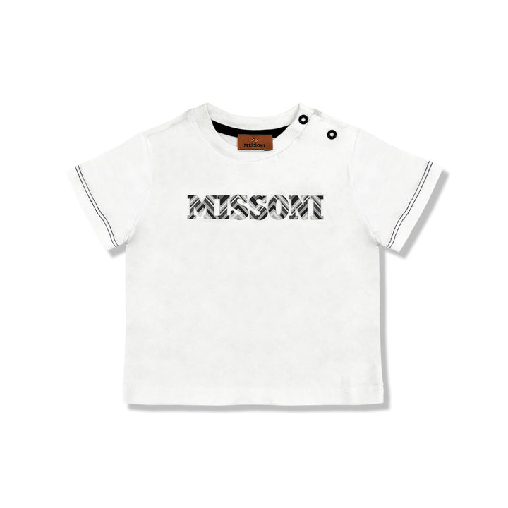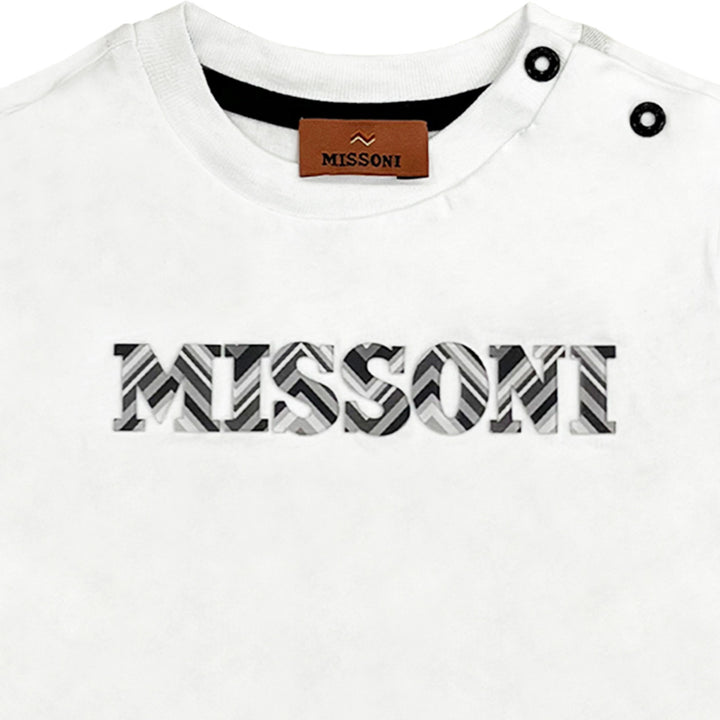 White cotton T-shirt for boys and girls by luxury French designer Missoni. It has a rubberised logo emblazoned across the chest, with an eye-catching rectangular print in blue, red, white and grey and a matching trim around the neckline. The T-shirt is made in super soft, comfortable jersey, with short sleeves that have blue overstitch detailing on the cuffs.