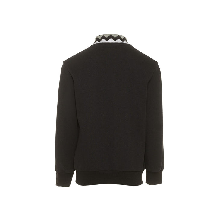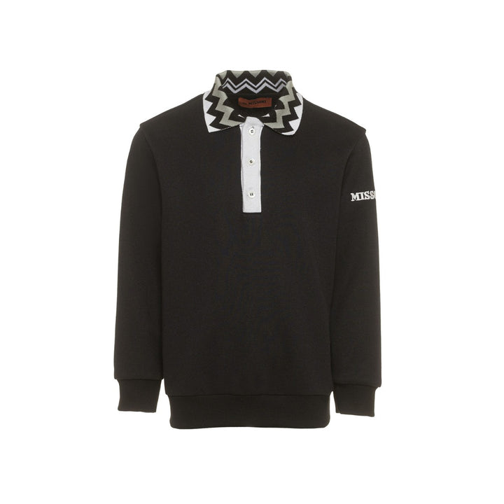 Black sweatshirt in brushed organic cotton, with long sleeves, collar, closure with buttons on the front. It is embellished with iconic chevron motif on the collar and embroidered logo on the sleeve.