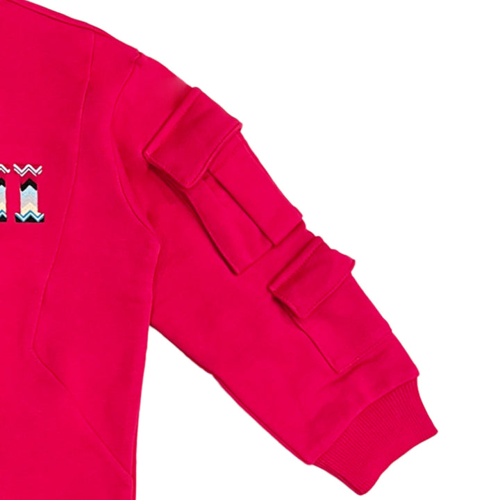 Red sweatshirt for boys by luxury Italian brand Missoni, made in soft, mid-weight cotton jersey. Casual and comfortable, it has an embroidered logo across the front featuring the designer's signature zigzag pattern, in red, blue and yellow. There are cosy ribbed trims and popper-fastening, cargo-style pockets on the sleeves.