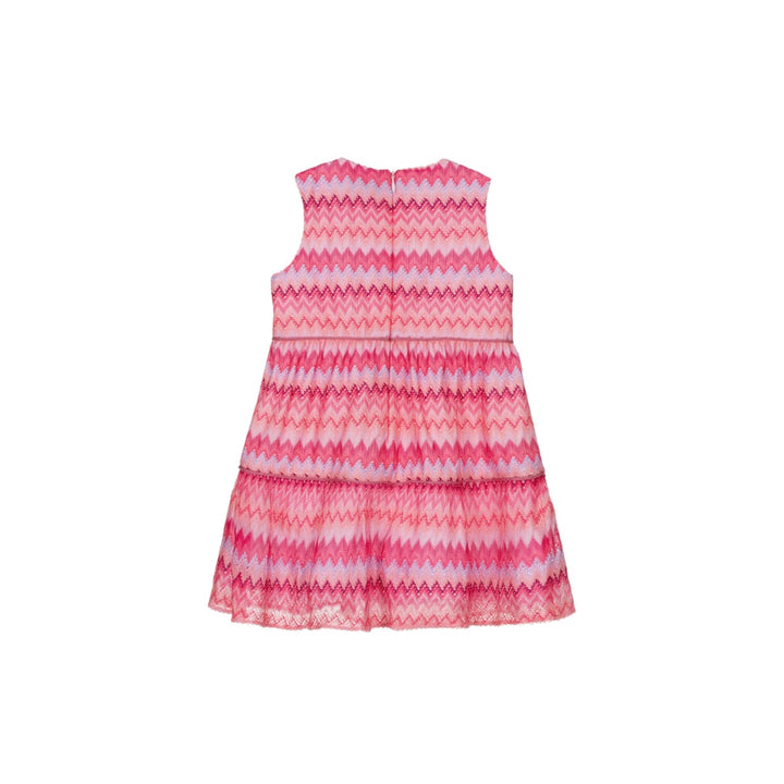 Pretty pink sleeveless dress for girls by luxury Italian fashion house, Missoni. For an instantly recognisable look, it is beautifully knitted in the iconic zigzag design, with a hint of blue in the pattern. Lightweight and flowy, it has lovely knitted piping trims, delicately embroidered edges, and is ideal for both casual and smart wear. The dress is fully lined in ivory cotton for comfort and fastens with a concealed zip on the back.