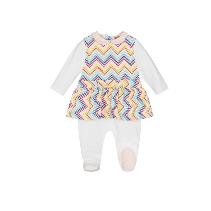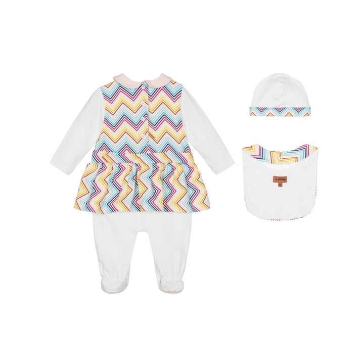 Charming white three-piece babygrow set for girls by Italian luxury brand Missoni, made in beautifully soft cotton jersey. Each piece is detailed with the designer's iconic zigzag pattern in pink, blue, yellow and grey stripes. The babygrow has a sweet pink collar and a ruffled skirt, with a bow detail on the waist. The bib is lined in soft and absorbent towelling and fastens with a popper on the back. A lined hat with a turn-up brim completes the outfit and the set is presented in a gift box.\