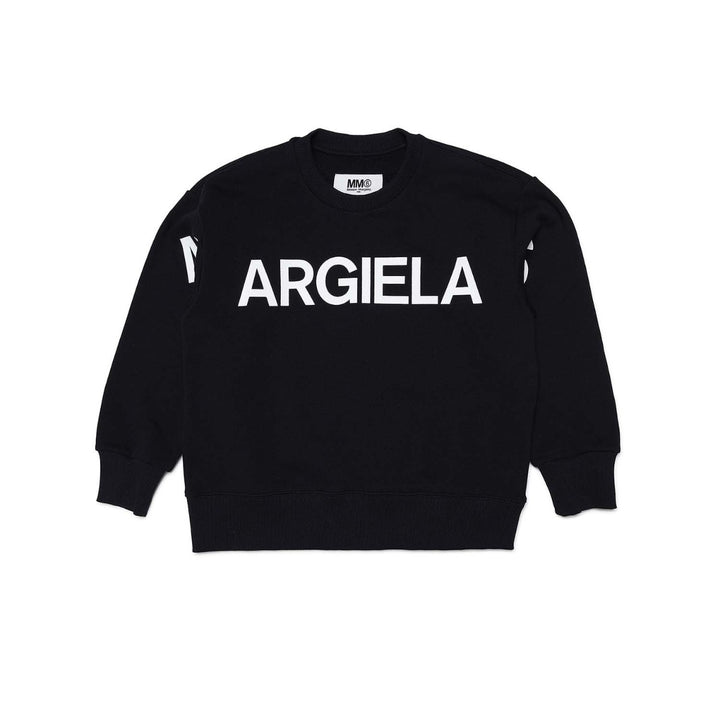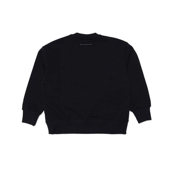 Long-sleeve, crew-neck black cotton sweatshirt with ribbed cuffs and hem and front print with contrasting color Margiela 6 displaced logo.