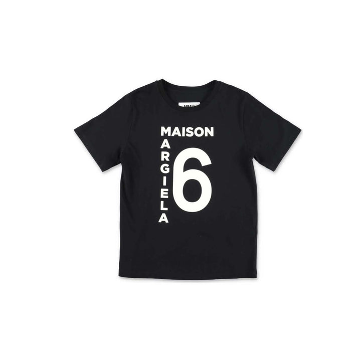 Short-sleeve, crew-neck white cotton jersey T-shirt with front six print.\