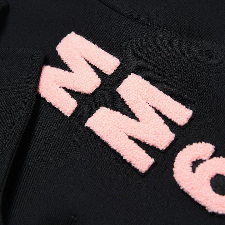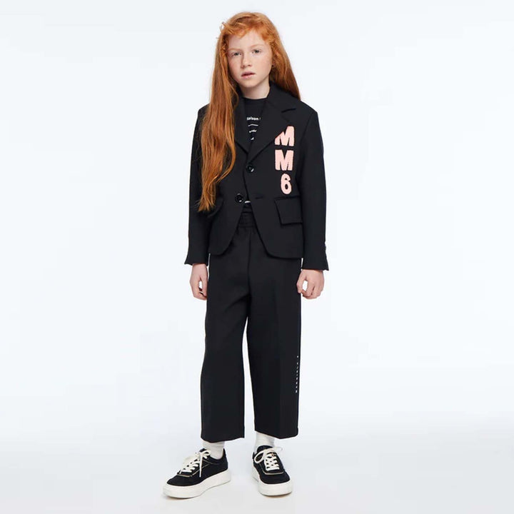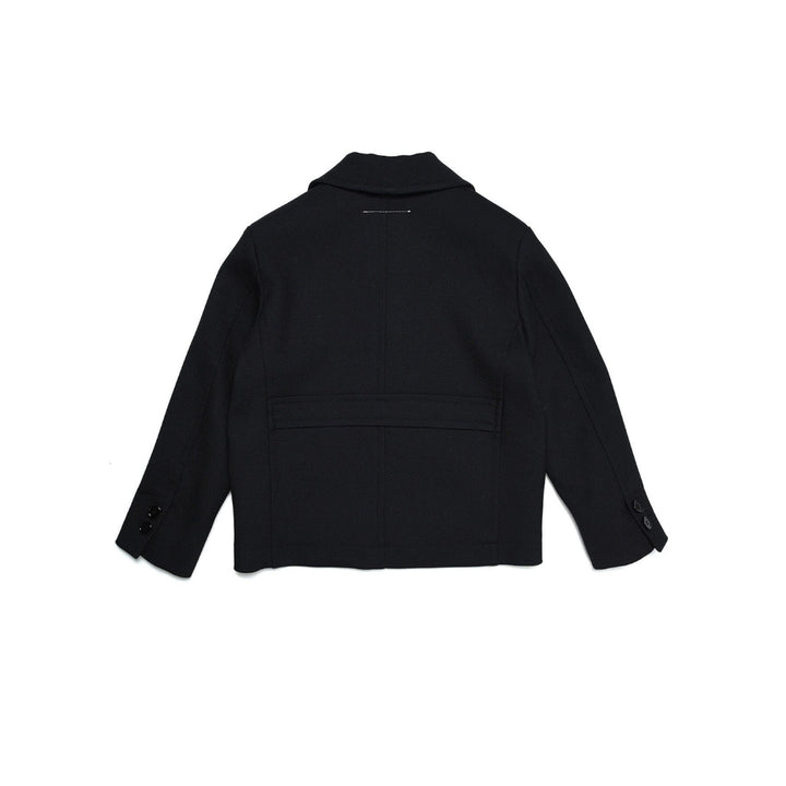 Black techno wool jacket with lapels, front 2-button fastening, front pockets with flap fastening and vertical terry stitch MM6 logo application.\
