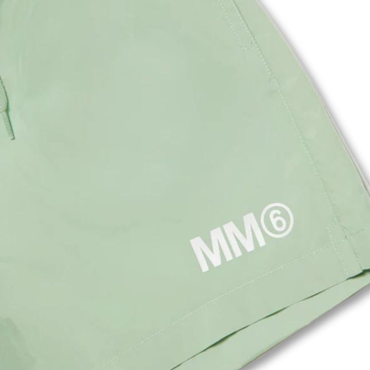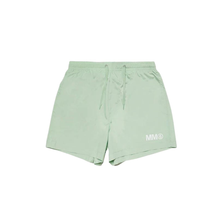 Nylon short boxer swimsuit with drawstring waist. Medium length. Featuring a contrasting color MM6 institutional logo on the front. Side pockets. Pocket and iconic stitching on the back. A garment designed to welcome summer in style.