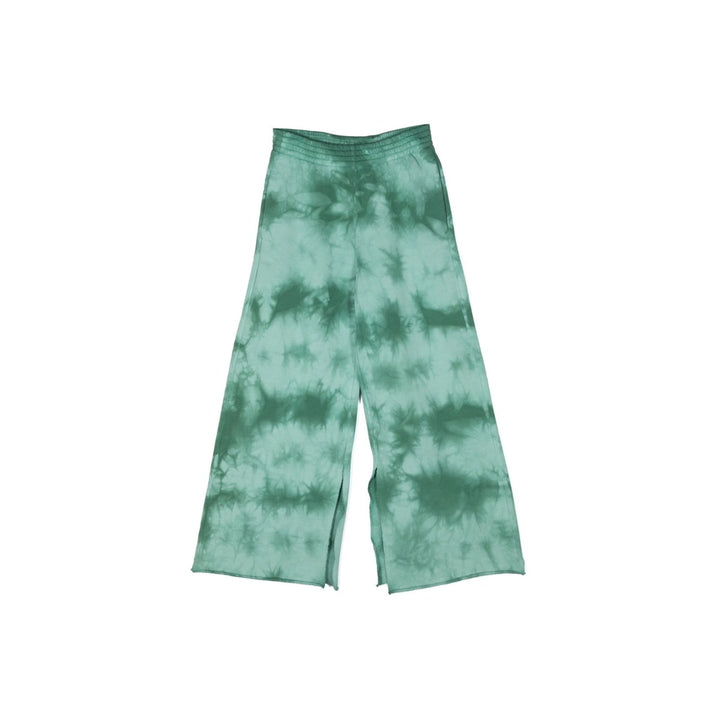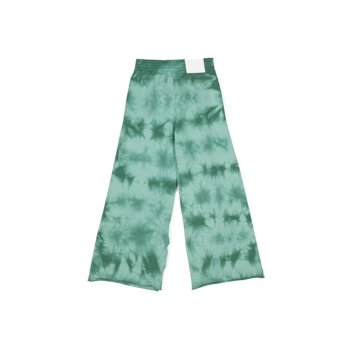 tie-dye wide-leg trousers from MM6 Maison Margiela Kids featuring light green, cotton, jersey knit, tie-dye print, decorative stitching, logo patch to the side, elasticated waistband, wide leg, raw-cut hem, side slits and two side slit pockets.
