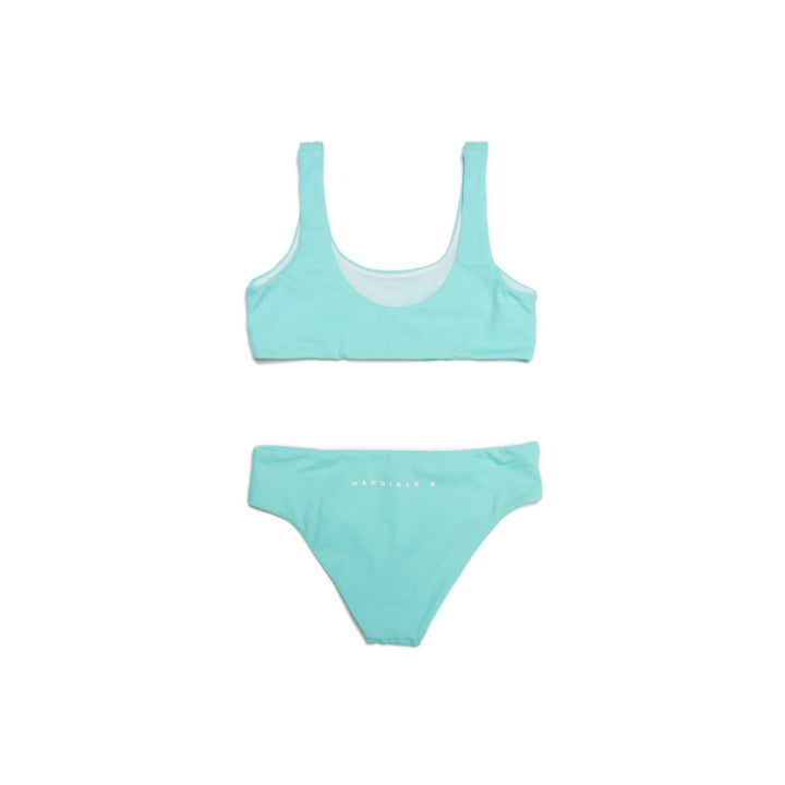logo-print bikini from MM6 Maison Margiela Kids featuring aqua blue, stretch-design, logo print to the front, scoop neck, wide shoulder straps, pull-on style, classic bottoms and logo print to the rear. Be mindful to try on swimwear over your own garments.