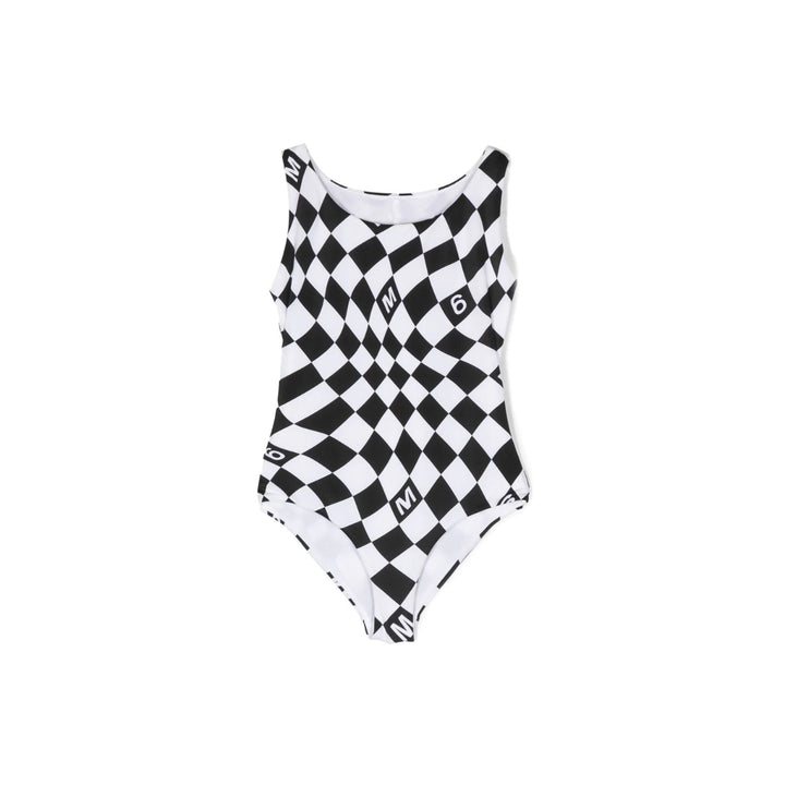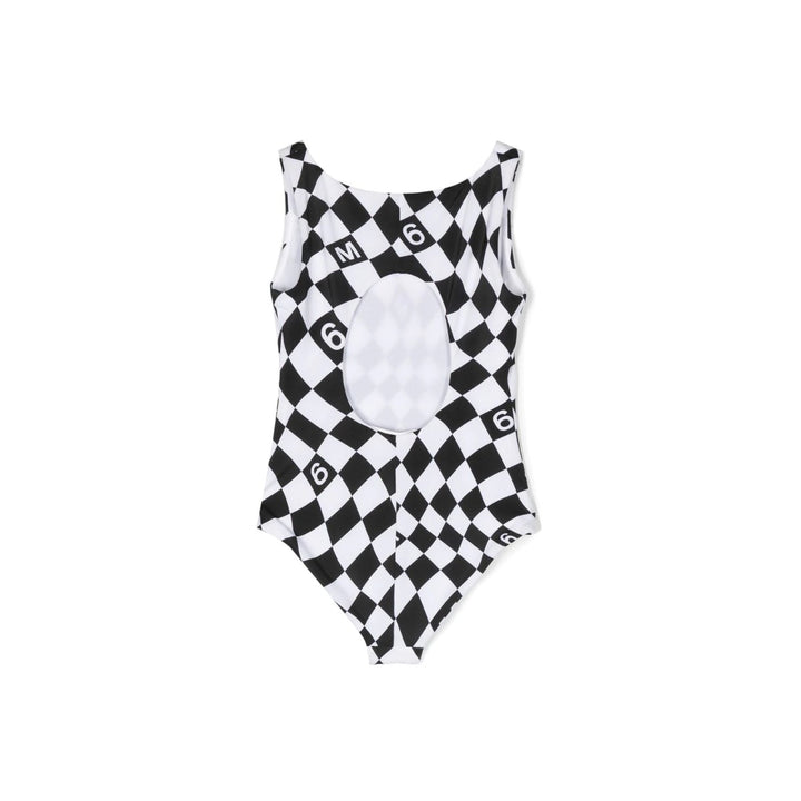 chequered logo-print swimsuit from MM6 Maison Margiela Kids featuring black-white, stretch-design, scoop neck, wide shoulder straps, cut-out detailing and chequered logo print.