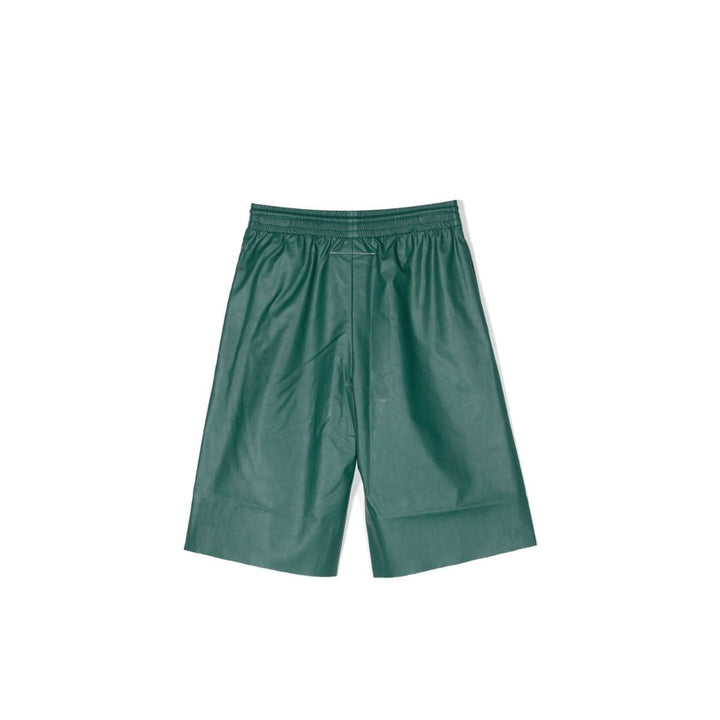 logo-embroidered shorts from MM6 Maison Margiela Kids featuring dark green, faux leather, decorative stitching, embroidered logo to the side, elasticated drawstring waistband, straight leg, raw-cut hem and two side slit pockets.