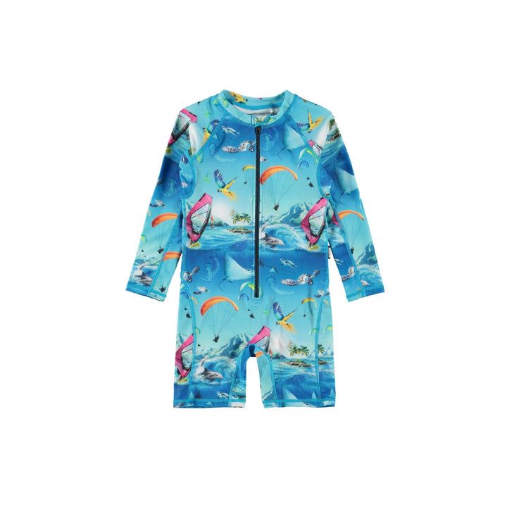 Fun blue onesie for boys by Danish brand Molo, just right for the beach or poolside. It is made in comfortable, stretchy recycled REPREVE jersey, with UPF 50+. Patterned with ocean animals and seaside sport images, it has long sleeves for full arm coverage. It fastens with an exposed black zip that has a useful chin guard.