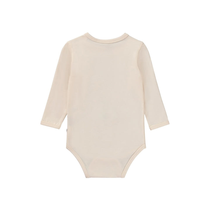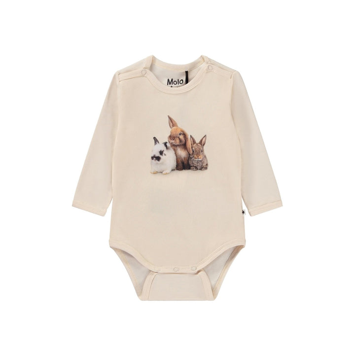 Rose coloured baby bodysuit with a print of a group of bunny friends on the front. This bodysuit is in 100% cotton, has long sleeves and easy snap closure at the neck and between the legs. Wear the bodysuit with the Seb pull on trousers in the same print.