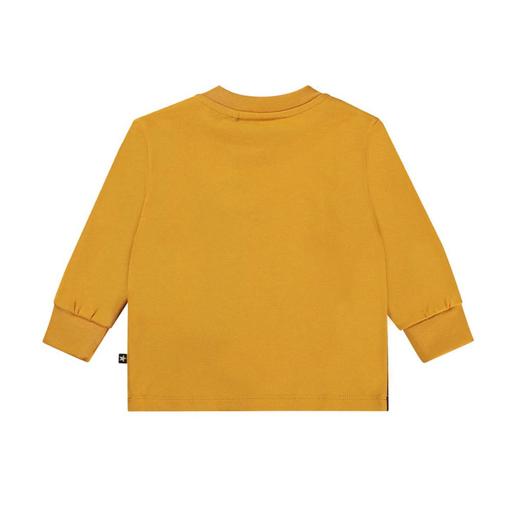 Orange top with a placement print for small children. The print has small rodents and various mushrooms from the floor of the forest. You can always find an adventure if you look closely. This top is in 100% cotton, has long sleeves and an easy snap closure at the neck. Wear it with the Sabb trousers in the Tree Root print.