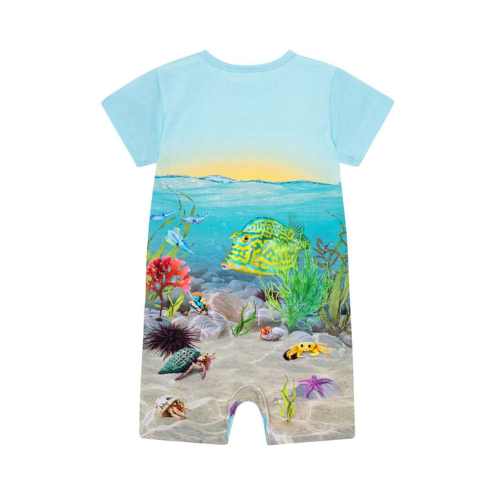 Baby unisex Short sleeve, blue romper in organic cotton. The romper has an easy snap closure at the neck and between the legs. It is in a loose, comfortable fit. The romper has a all around print of a sunset and a peak at the bottom of the ocean with colourful fish and plants.