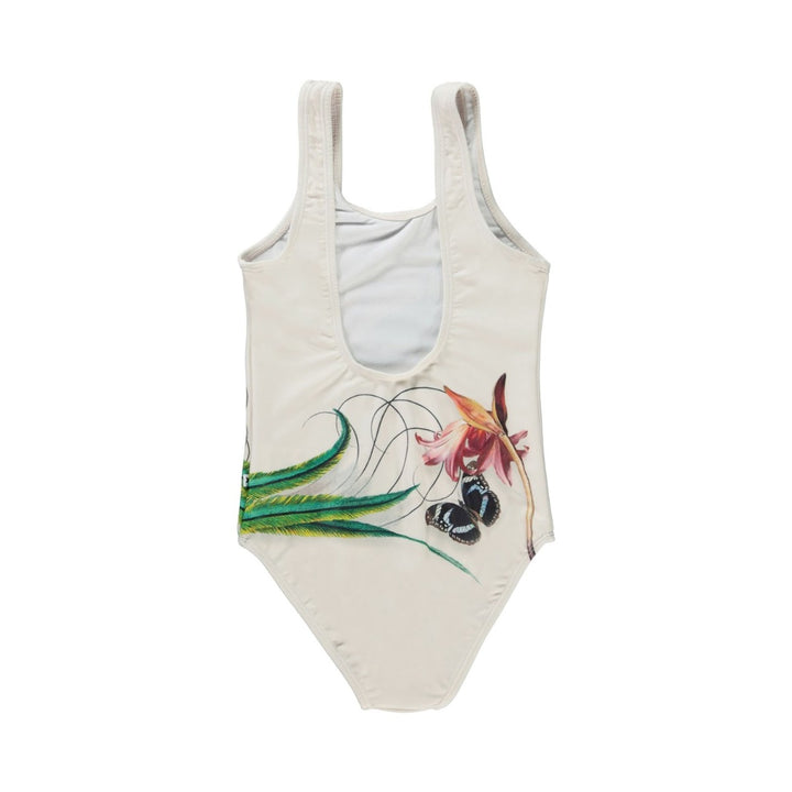 Nika is a classic swimsuit in a light colour with a bird print. Molo's swimwear has 50+ UV protection. This Molo product is recycled and made from REPREVE reusable polyester. REPREVE is the leading, most trusted brand in reusable fibres and is made from used plastic bottles and other waste materials. The production of recycled polyester utilises far fewer resources and emits less CO2, making Molo’s recycled swimwear a sustainable choice.