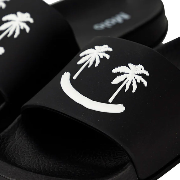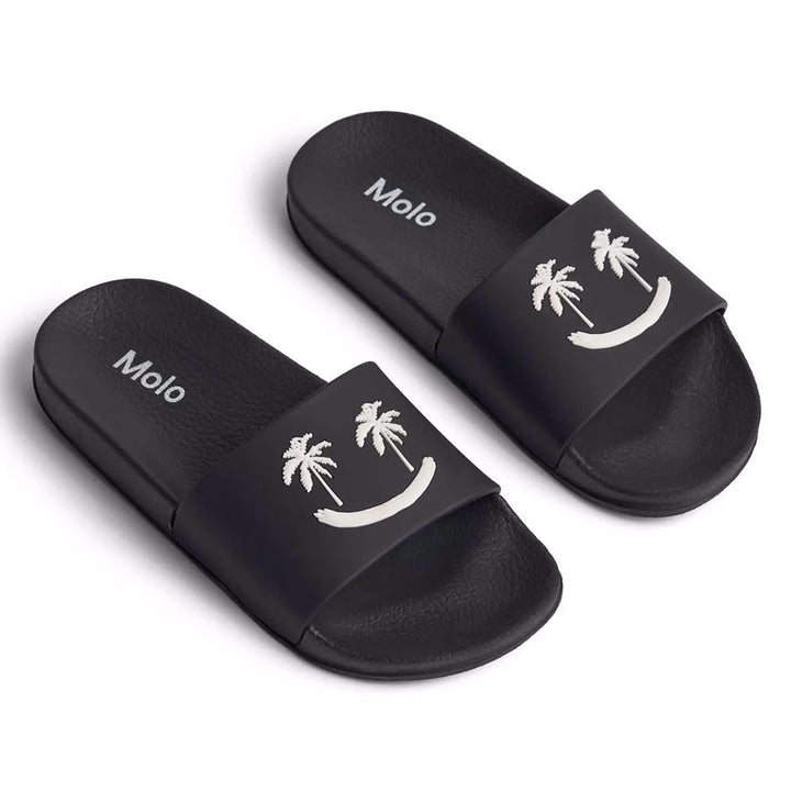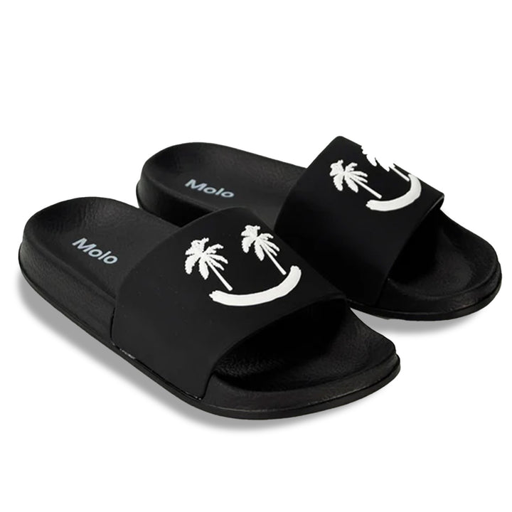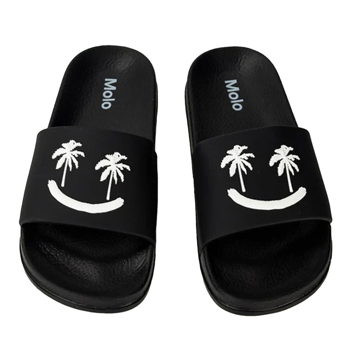 Molo's Zhappy sandals are a must-have for the summer heat when your toes need some air. These slippers are black with fun, white smiley faces with palm trees.