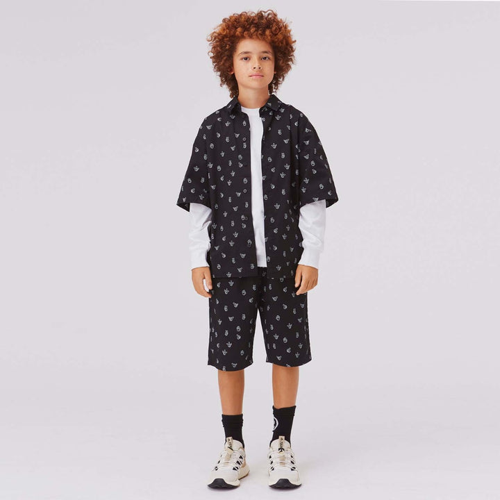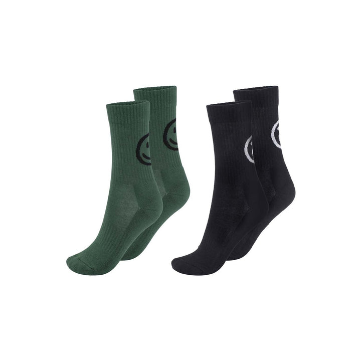Two pairs of black and green socks for boys by Molo. They are made from a ribbed, softly knitted cotton blend for a sporty look. The black pair have a white smiling face logo on the ankles. The green pair have a black smiling face logo. Both pairs have logos on the sole.