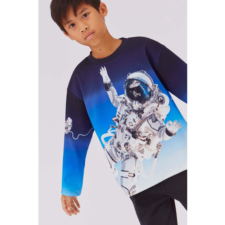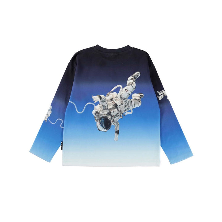 Cool blue ombre T-shirt for boys by Danish brand Molo, with a white spaceman printed on the front, making the peace sign. With a logo tab on one side seam, it is made in comfortable, eco friendly, organic cotton jersey, ideal for casual wear.