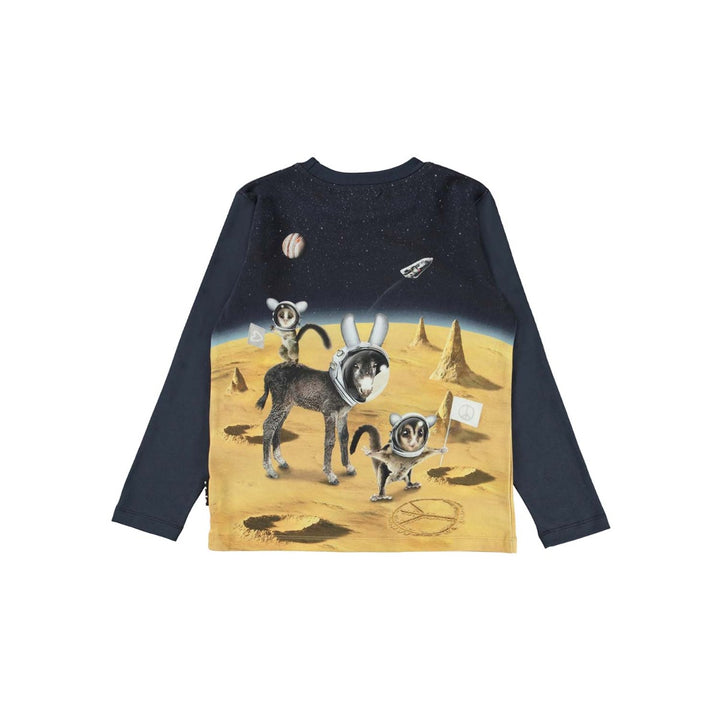 Easy-wearing navy blue top for little boys by Molo, made in mid-weight organic cotton jersey. Fastening with poppers on one shoulder, it has an planet surface print on the front with cute animal astronauts.