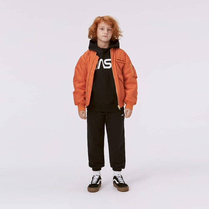 Black joggers with a NASA logo in white printed on the front. They are in 100% cotton, have an elastic waist with inner ties, elastic at the legs, side pockets and a back pocket. They are in a regular fit. Wear them with the Moz hoodie in the same colour for the perfect set.