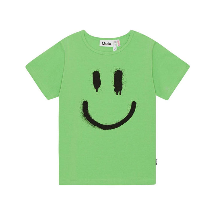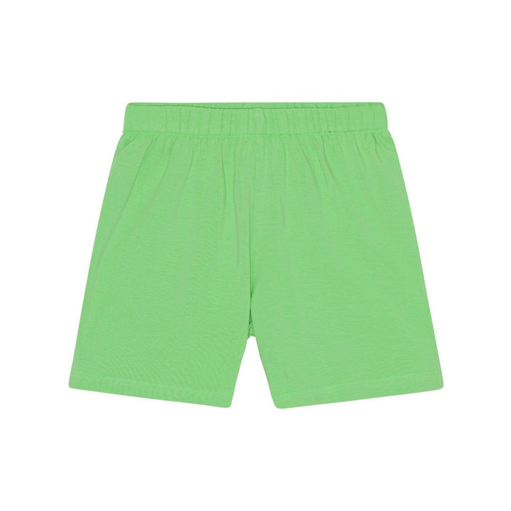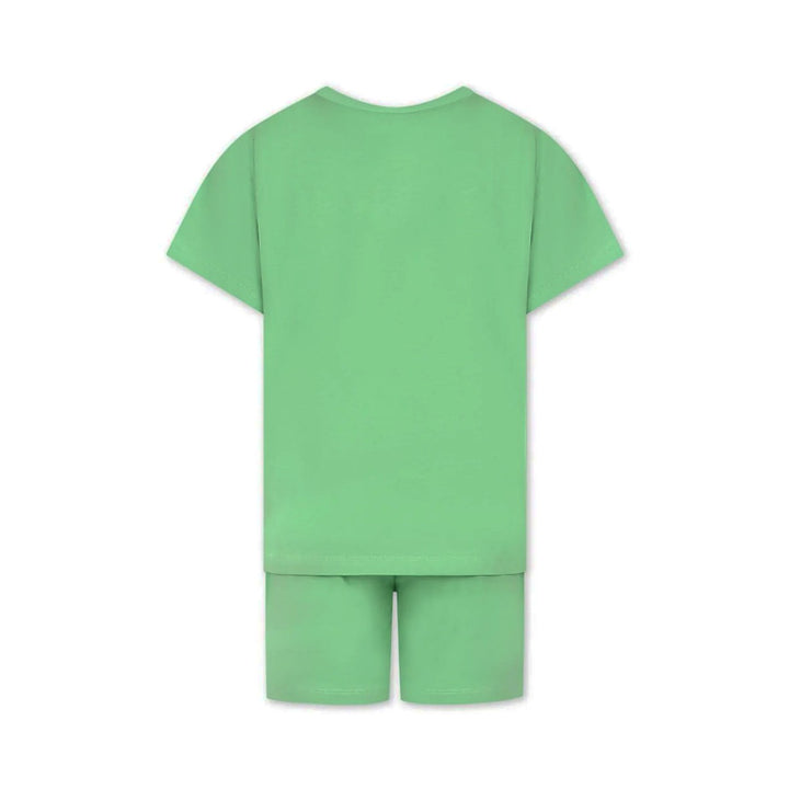Boys green nightwear set with a print of a smiling face in organic cotton. The set has a loose t-shirt and a pair of shorts with an elastic waist.