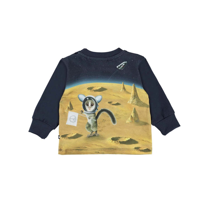 Easy-wearing navy blue T-Shirt for little boys by Molo, made in mid-weight organic cotton jersey. Fastening with poppers on one shoulder, it has an planet surface print on the front with cute animal astronauts.