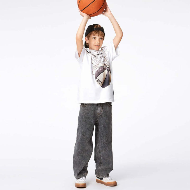 White short-sleeved T-shirt for boys by Molo, made in soft organic cotton jersey. Casual and easy-to-wear, it has a grey basketball graphic printed on the front with a 'Peace Out' slogan.