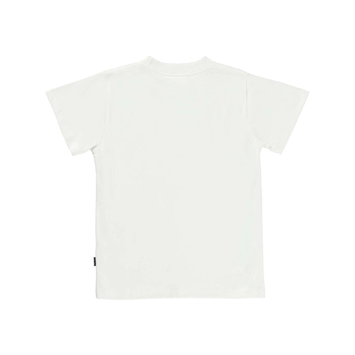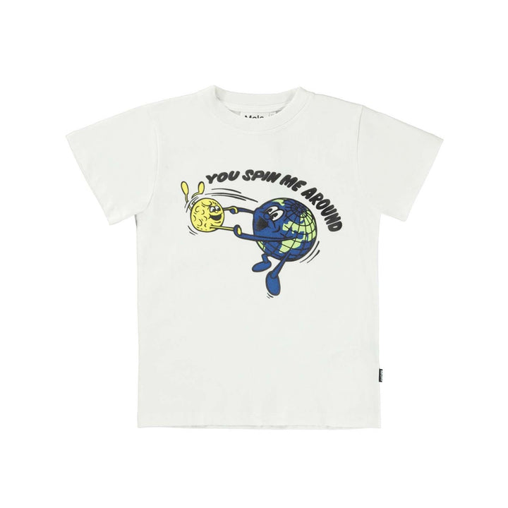 White cotton T-shirt for boys by Danish brand Molo, with a quirky blue and yellow print of the Earth and the Sun on the front. With a logo tab on one side seam, it is made in comfortable jersey, so is ideal for relaxing in all day,