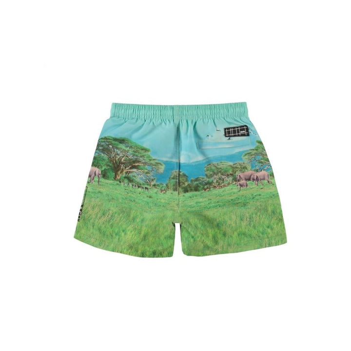 Niko is a pair of sporty swim shorts with a print of a beautiful landscape with a lion in the front. Niko has an elastic waist with ties to ensure a comfortable fit. Wear them with a matching t-shirt. Molo's swimwear has 50+ UV protection. This Molo product is recycled and made from REPREVE reusable polyester. REPREVE is the leading, most trusted brand in reusable fibres and is made from used plastic bottles and other waste materials. The production of recycled polyester utilises far fewer resources and emits less CO2, making Molo’s recycled swimwear a sustainable choice