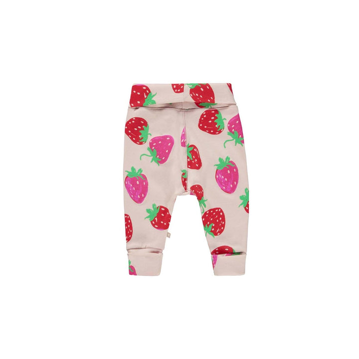 Molo pair of pink trousers with a print of strawberry all over. They have a wide elastic rib at the waist and legs and visible stitching in the front that gives them a sweatpants look