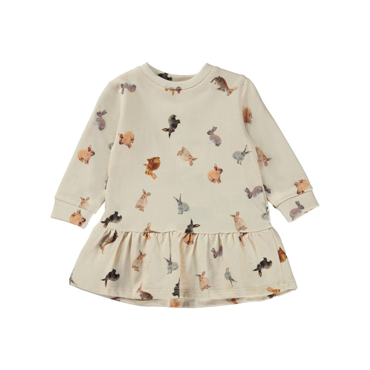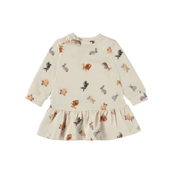 Beige dress for baby and younger girls by Danish brand MOLO. Made from soft organic cotton, it feature a all-over rabbit print pattern and flared skirt. It has a ribbed trims and fastens with poppers on one shoulder for easy dressing.