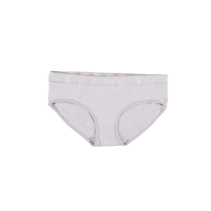 Pack of two organic cotton jersey knickers for girls by Molo. One is lilac purple and the other is a dark beige with a sweet floral print. Both have jacquard star logo, elasticated waistbands for a comfortable fit