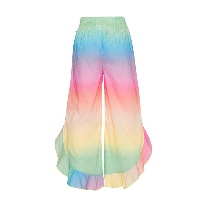 A pair of colourful wide-leg swim trousers for girls by Danish brand Molo, with a fun and vibrant rainbow effect pattern. Great as a cover-up on the beach or by the pool, these gentle-on-the-skin trousers are made in soft, lightweight organic cotton. The curved hem and ruffled edges add a little extra flounce to this fabulous design. The waist is elasticated around the back for simple dressing and the logo tab on the side completes the look.