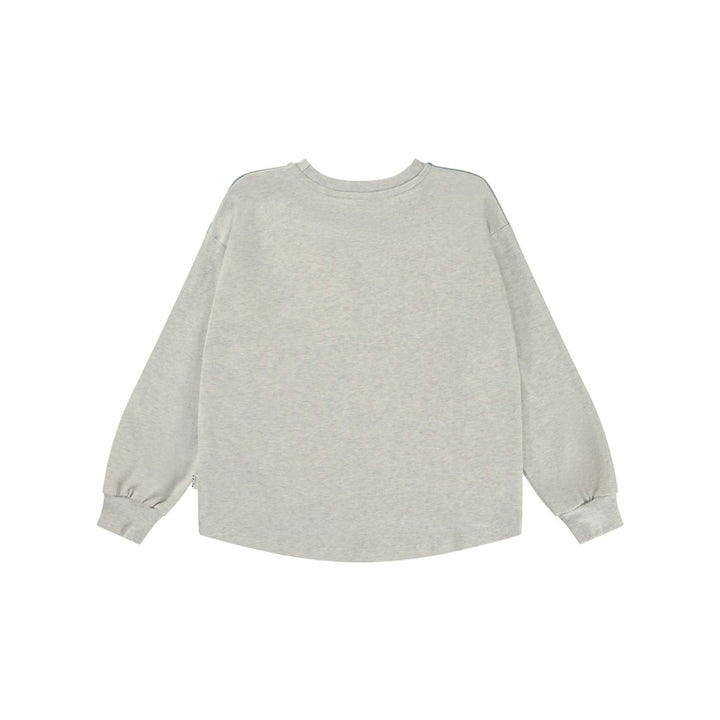 Grey melange top with a llama print on the front. The humourous print shows two llamas that are wearing Molos own knits, and they are all bundled up in hats, infinity scarves and jumpers. This top is in 100% cotton jersey, has long sleeves with a rib edge, a round neck with rib and is in a loose fit.