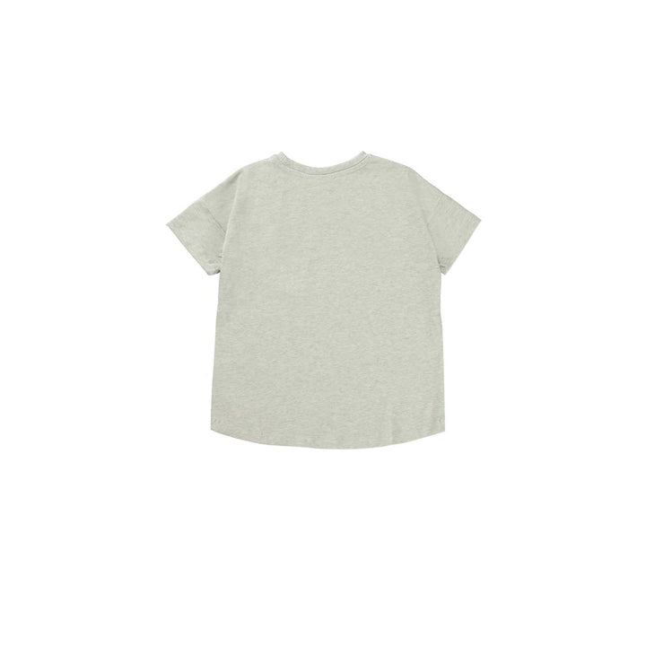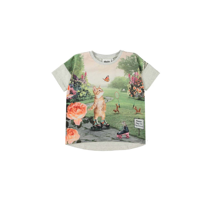 Cute grey marl T-shirt for girls by Molo, made in soft organic cotton jersey. Printed with an adorable kitten on roller skates printed on the front in a colourful garden, it has a relaxed crew neckline for casual wear.