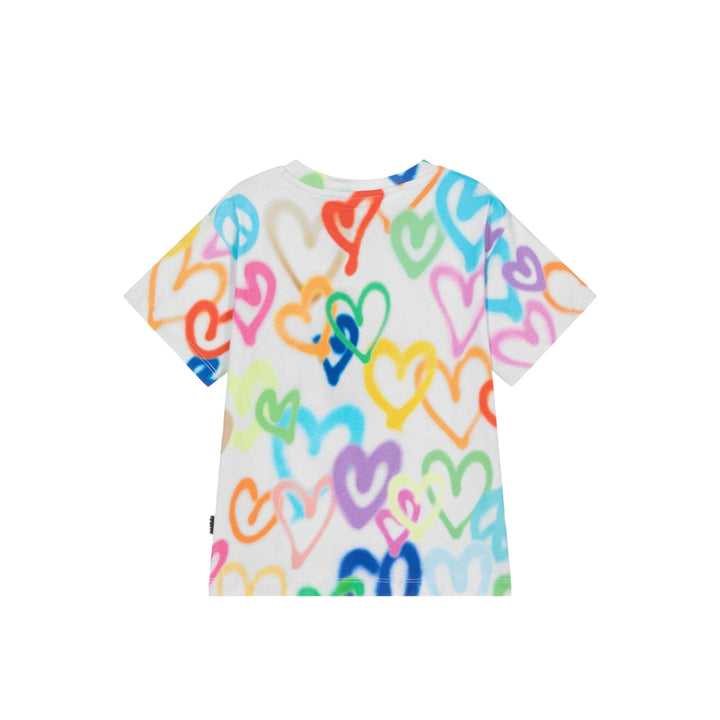 Patterned in multicolour hearts with a spray paint effect, this white short-sleeved T-shirt for girls is by Danish brand Molo. Casual and comfortable, it is made in organic cotton jersey, with a crew neckline. A logo tab on the side seam adds a subtle designer finish.