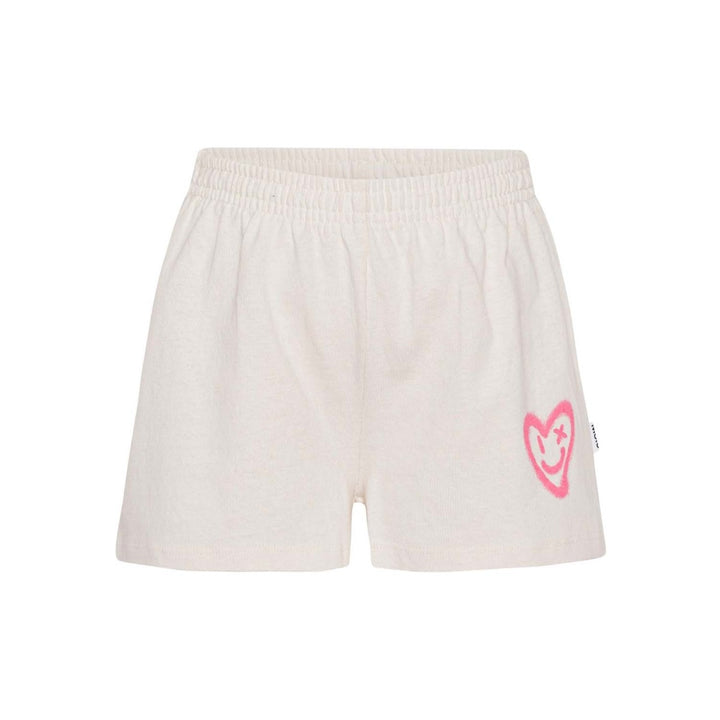 Girls Off-white cotton shorts in a small print of pink hearts. The shorts are in a sporty, loose-fitting look and have an elastic waist.