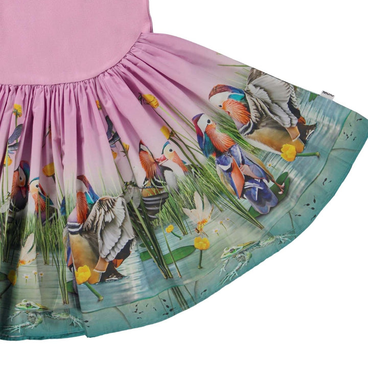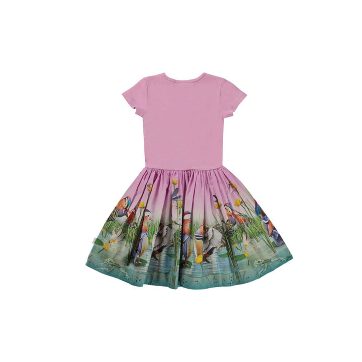 Girls lilac pink dress by Molo, made in organic cotton. Cool and casual, this dress has a soft ribbed jersey bodice with capped sleeves and a smooth poplin skirt, patterned with a quirky duck and buttercup flower graphic print in hues of green, blue and orange for a pretty finish.
