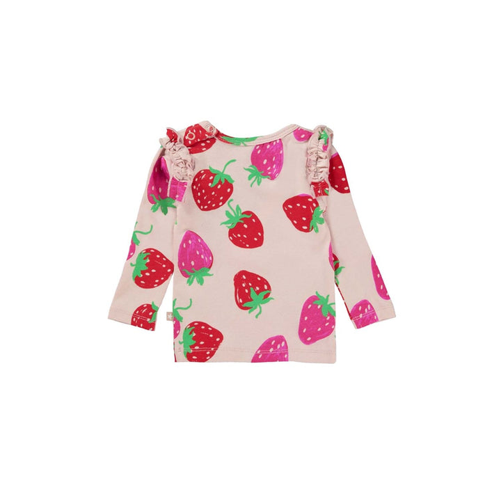 Pale pink TOP for girls by Danish brand Molo, made in soft and stretchy organic cotton jersey. Patterned with pink, red and green strawberries, this fun design features cosy long sleeves and a rounded neckline. It slips on over the head for easy bedtime dressing.