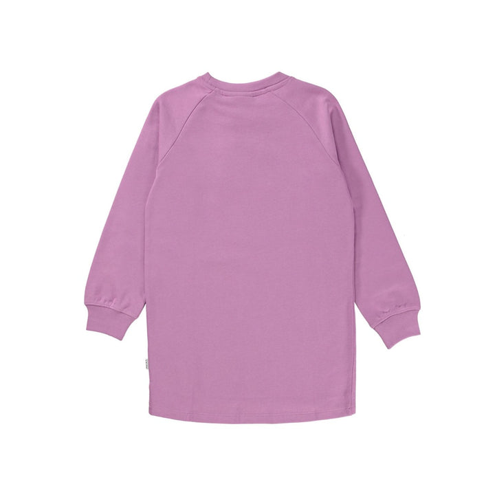 Pink dress in GOTS certified cotton fleece, with long sleeves, crewneck, ribbed cuffs and hem. It is embellished with smileys on the front