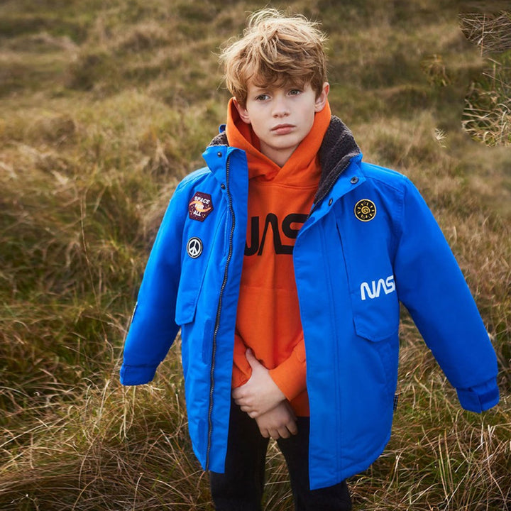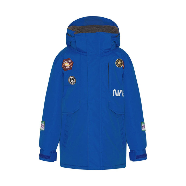 Blue winter jacket with Nasa patches and large pockets on the front. The jacket is part of Molo’s 'Everyday Exploration’. It's outerwear for everyday activities, which is practical but at the same time great looking. The jacket is, of course, also responsibly produced in recycled materials, ensuring it lives up to Molo’s high standards for outerwear.\