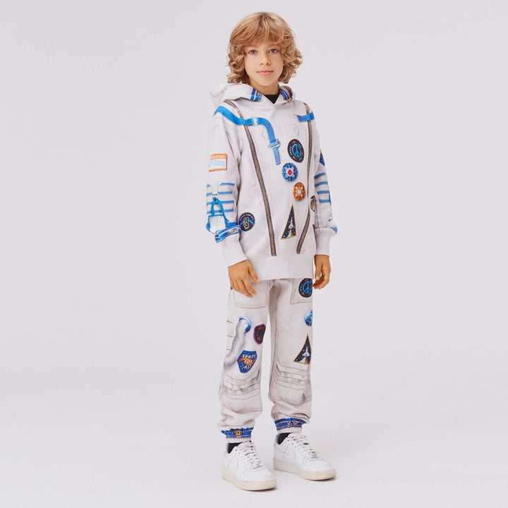 Venture into outer space in these grey joggers for boys by Molo. Made in mid-weight organic cotton jersey, the sweatshirt fabric has an astronaut spacesuit print, with orange and blue trims and badges. They have an elasticated waist and ankle cuffs, with an internal drawstring.