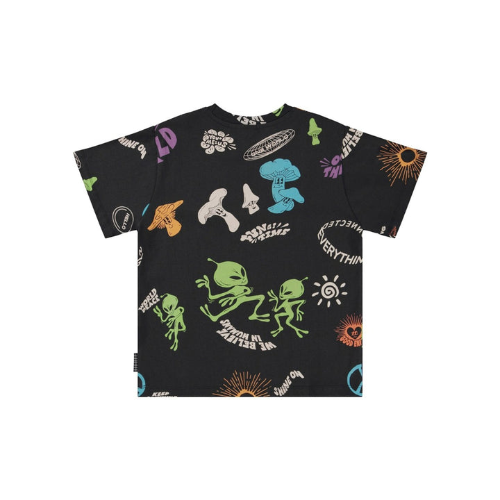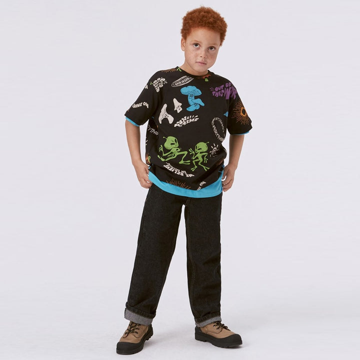 Black t-shirt in a multi-coloured placement print. The print shows elements from different prints in various collections. Say hi to dancing aliens, a shining sun, all the planets, a smile, beating hearts, a peace sign and happy mushrooms. What a party! This t-shirt is constructed in 100% cotton, has short sleeves, a round neck with rib and is in an oversized fit.