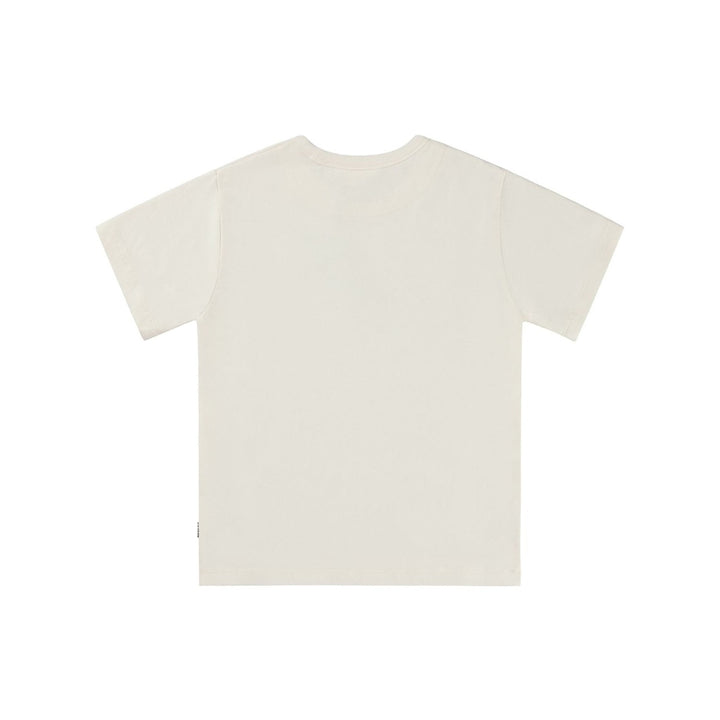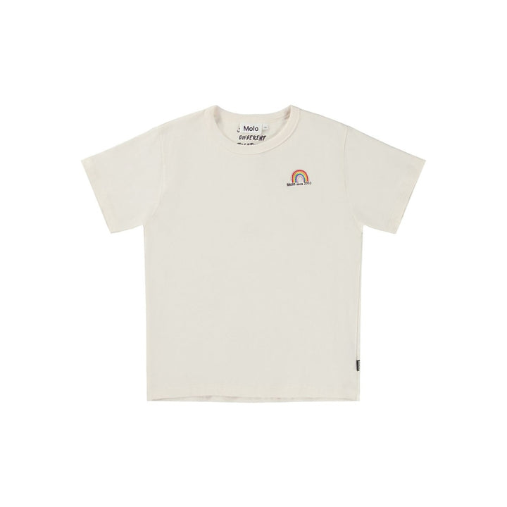 This is a white t-shirt with a rainbow embroidery on the chest. It has short sleeves and a round neck.
