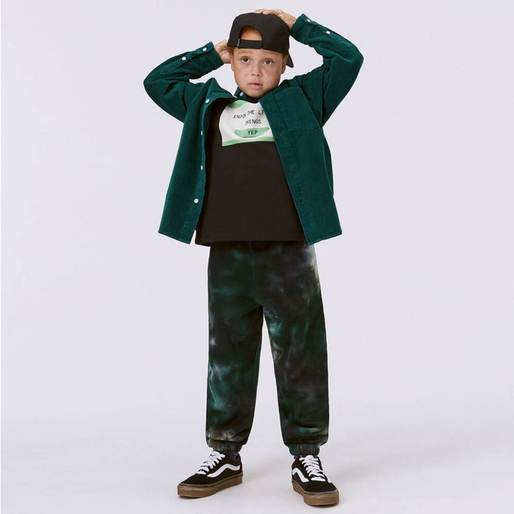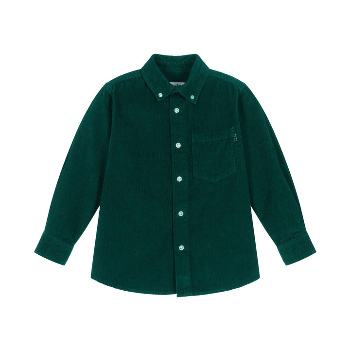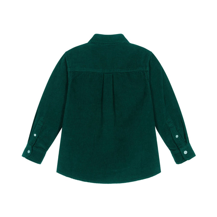 Dark green shirt in a pin wale corduroy with long sleeves. This shirt is constructed in 100% cotton, has a button down collar, a chest pocket, white buttons and a pleat on the back for a looser fit. Wear it alone or as an overshirt, unbottoned over a t-shirt for a cool and relaxed look.